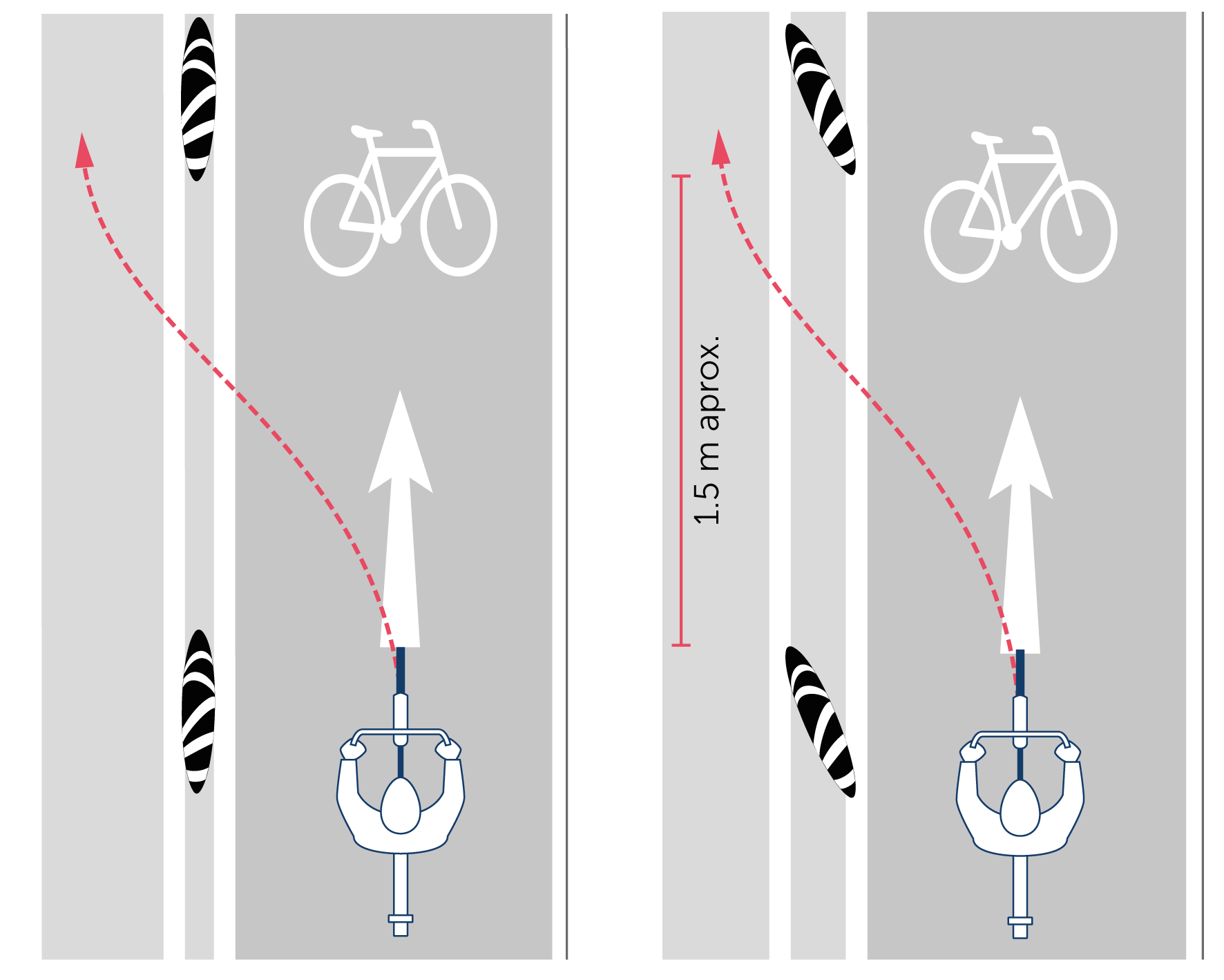 - Segregación física: Para mejorar las condiciones de comodidad y seguridad de quienes van en ciclos, a este espacio de separación se le pueden agregar elementos de segregación volumétricos, firmes y robustos, de hasta un metro de altura, que tienen el potencial de inhibir el paso de automóviles hacia las ciclovías. La eficacia de estos dispositivos dependerá de la velocidad con la que un automóvil pretenda atravesar. La velocidad de circulación es determinante al momento de elegir el tipo de barrera física para reforzar la segregación.